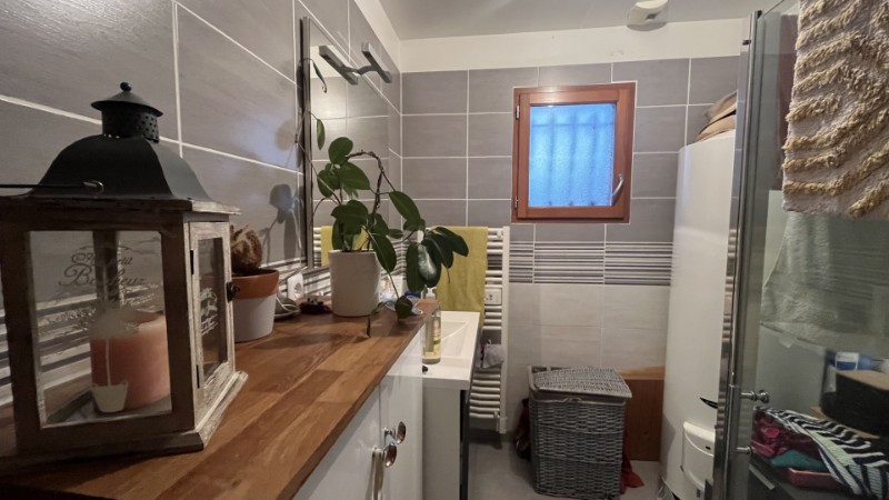 Superficie habitable de 100m² comprenant: Une entrée, un séjour de 38m² avec un conduit existant, cuisine aménagée et équipée avec un coin repas donnant sur l'extérieur, cellier / laverie, wc, salle de douche avec meuble vasque.