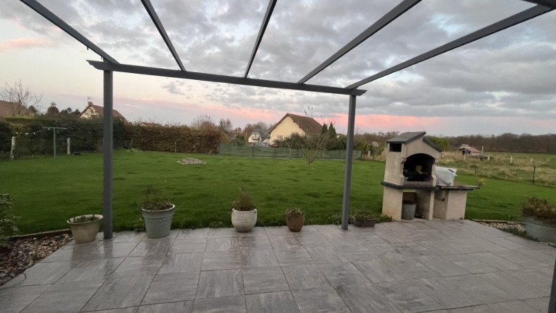 Garage attenant, terrasse carrelée avec une pergola, terrain plat, clos et arboré de 1341m².