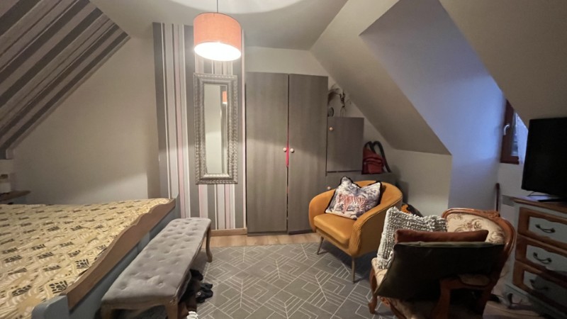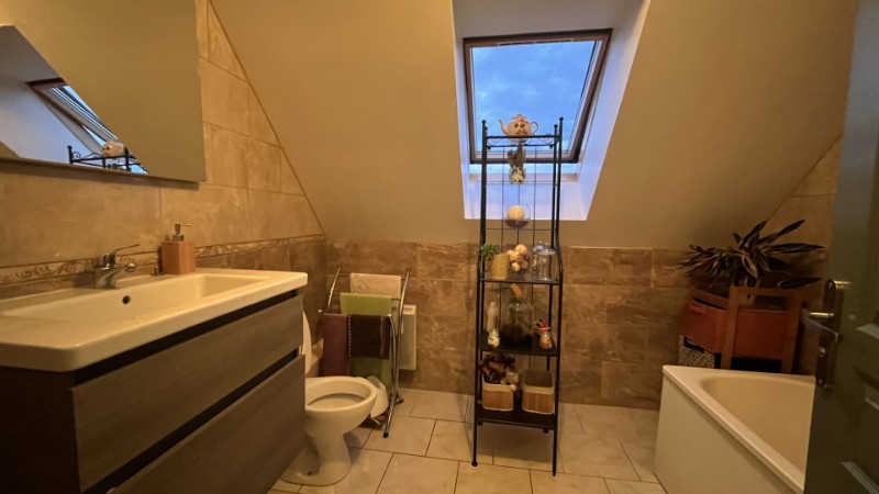 A l'étage: Palier, 3 chambres dont une grande, salle de bains avec wc.