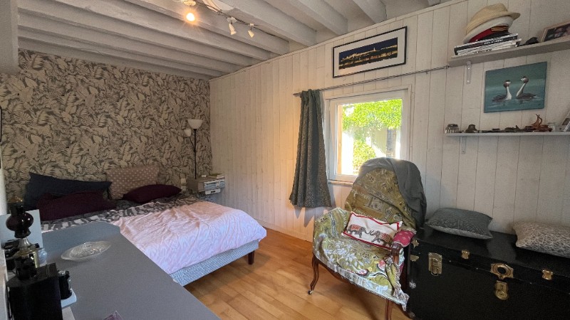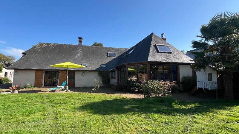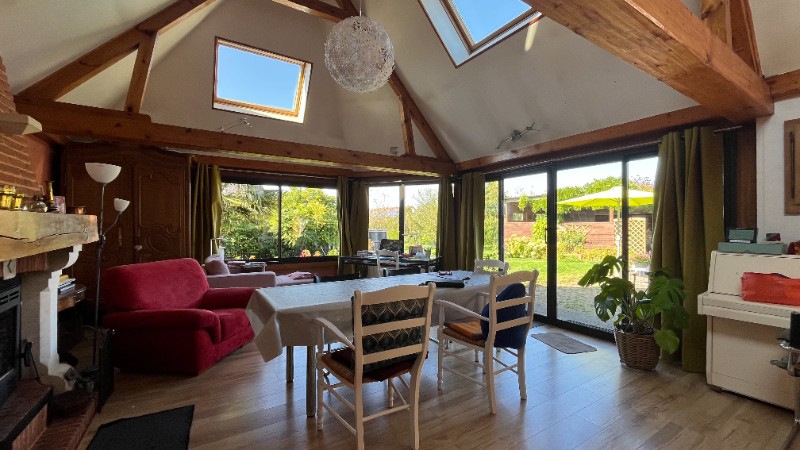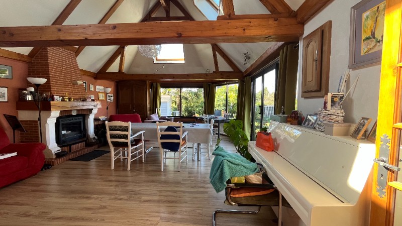 Une entrée, cuisine aménagée et équipée avec un coin repas ainsi qu'une cheminée insert, arrière cuisine donnant sur la terrasse, wc, salle de douche, deux chambres dont une avec un dressing fermé, un salon d'hiver donnant sur une superbe extension avec cheminée insert, plafond cathédrale qui donne une grande luminosité avec des baies vitrées ouvertes sur le jardin.Au 1er étage: un grand palier en mezzanine (possibilité de faire une chambre), chambre.Dépendances avec atelier, laverie, garage, cave à vins, carport, abri bois.Terrain plat, clos et arboré de 1457m². Située dans un secteur calme sans vis-à-vis.